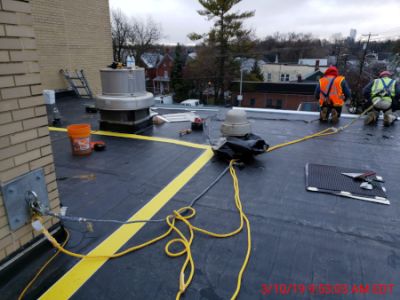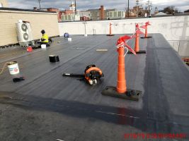 Westerly removed and replaced a new and improved roof for Building 60, at the Carderock Naval Surface Warfare Center, in Bethesda, Maryland. This was a design-bid-build roofing project showcasing our demolition and exterior renovation skills. Westerly provided a full comparison takeoff to the owner with the advantages and disadvantages of both cold applied and spray foam application of the roof. After determining the Spray Foam was a system better suited for dry climates, we agreed to use the cold applied roofing system, Styrene-Butadiene-Styrene (SBS) Two-Ply Roofing. Westerly was able to convey that the SBS is a strong, resilient, asphalt-modified bitumen membrane containing a core of non-woven polyester mat coated with durable SBS modified asphalt and a ceramic granule surface designed for hot mop and cold adhesive applications.. At the start of this project, Westerly developed a strategy to complete the removal and replacement of the new roof for Building 60, by section and elevation. Westerly performed several safety measures prior to beginning the project: by utilizing parapet clamps with wood railings along the perimeter of the roof for fall protection, tight scheduling with the roofing subcontractor was established to ensure water tightness and prevent leaks at the end of each work shift. Before mobilization, Westerly cleared out steel debris stationed at our contractor’s laydown area. Westerly developed a strategy to reinstall the roof, including mapping out how the project could be finished. We replaced the south (approximately 80 feet by 130 feet) and north sections housing the rooftop chillers, approximately 135‐foot by 100‐foot. The project was split into two sections: the higher roof of 10,087 square feet (south elevation) and the lower roof of 13,049 square feet (north elevation). Westerly used a fork lift to place materials on the north roof. We used a crane to raise and lower materials for the south roof, which required a crane plan, crane inspection, and NAVFAC inspection. We removed the existing built‐up 2‐ply asphalt roof system and replaced it with 3‐ply Styrene‐Butadiene‐Styrene (SBS) with cap sheet system down to the roof deck. Westerly applied numerical values in squares for the portions of the roof to be demolished and reinstalled the same day. Mechanical roof piping was raised and re-supported during new roof installation. perform daily inspections in the mornings to identify any leaks and ensure water tightness. Weather checks were also performed to indicate days when a 30% chance of rain or snow would occur. On these weather days, no installation was performed. Westerly also performed these checks prior to starting the next section of roof installation. While working on Building 60’s roof, Westerly identified an existing wooden staircase that failed to meet code requirements. Once the assignment was complete, Westerly demolished the fragile stairs and constructed a new code compliant flight of stairs, at no additional cost to the client.